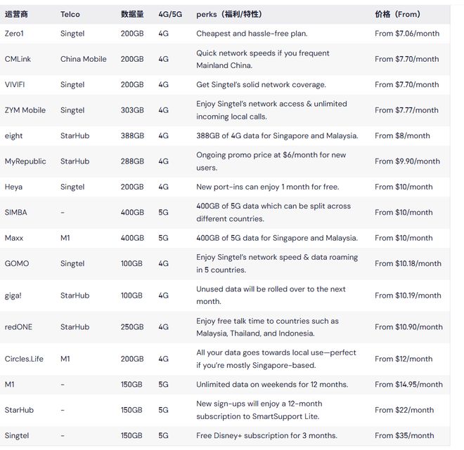 - 比较4G和5G的数据速度与费用,有助于选择最适合用户使用习惯的选项。- 在新加坡市场上,多个运营商提供不同价位和配置的SIM卡月费计划。