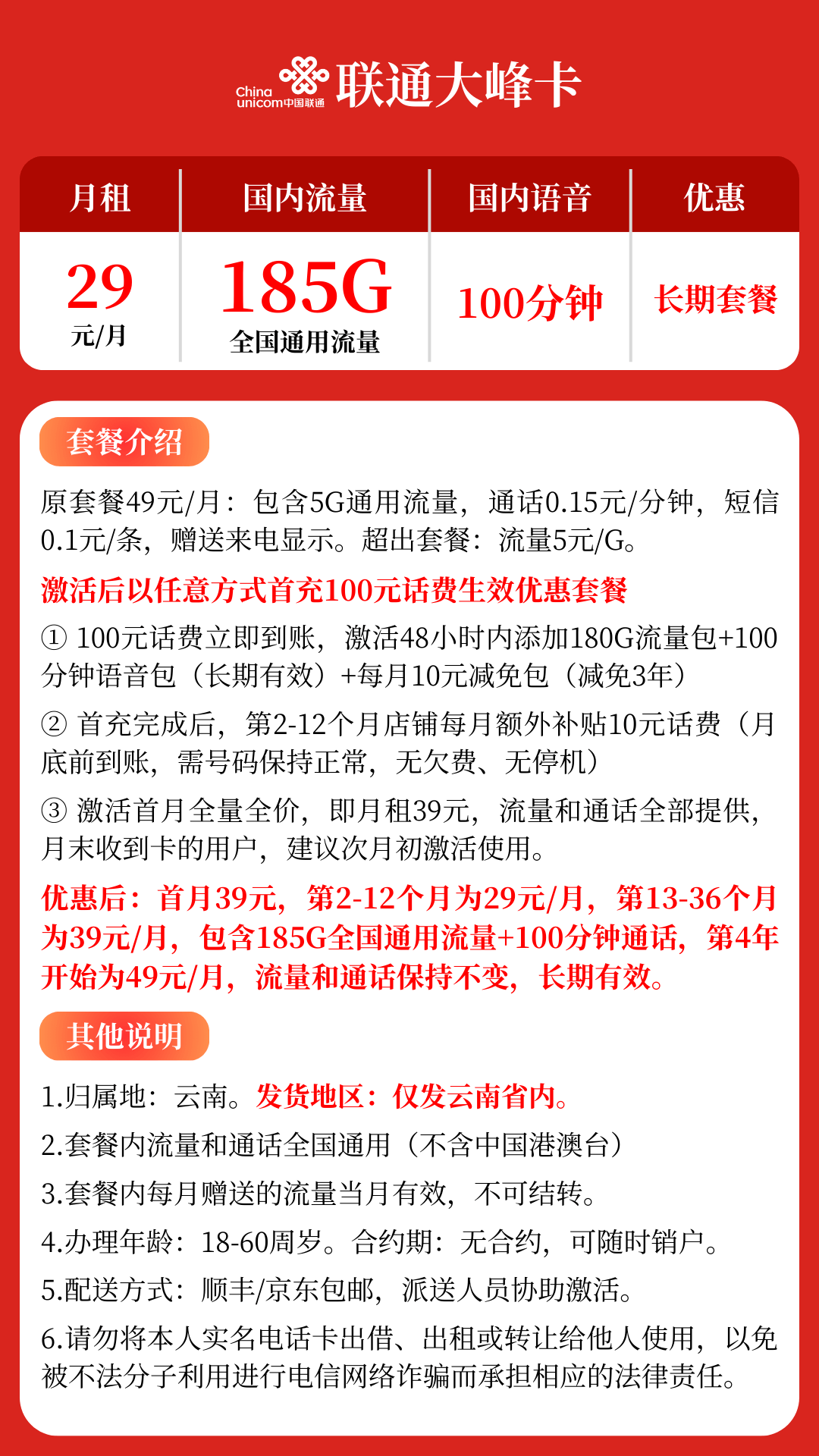 云南联通峰卡29元185G全国通用流量+100分钟通话